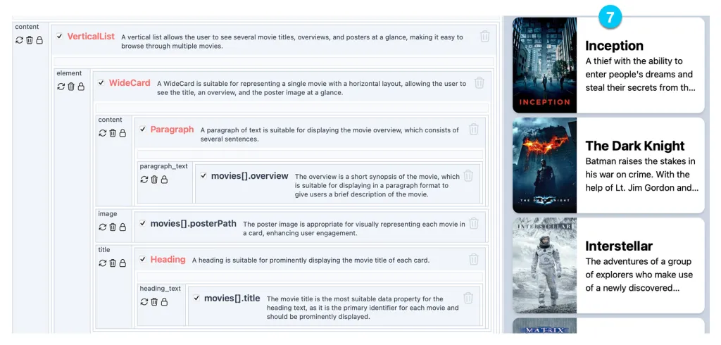 Bu yapı ayrıca henüz tanımlanmamış parçalar için yer tutucular (örneğin, bir buton etiketi, bir resim veya bir içerik bölümü) ve birden fazla olası UI alternatifi içerebilir. Örneğin, aynı içeriği bir liste veya bir ızgara olarak temsil edebilir.