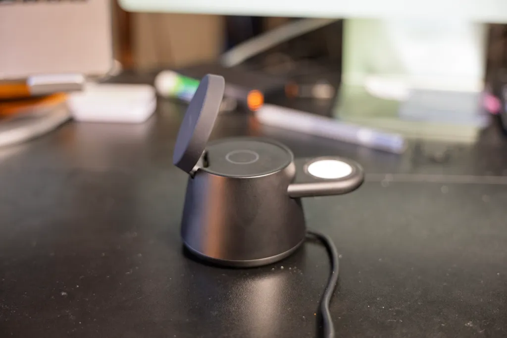 Apple Watch şarj cihazı içerden katlanarak çıkıyor ve üç farklı açıda durabiliyor – tamamen düz de dahil. Yan yana bir kurulum istiyorsanız bu oldukça hoş. Ayrıca, düşük yüksekliğiyle StandBy için de harika.