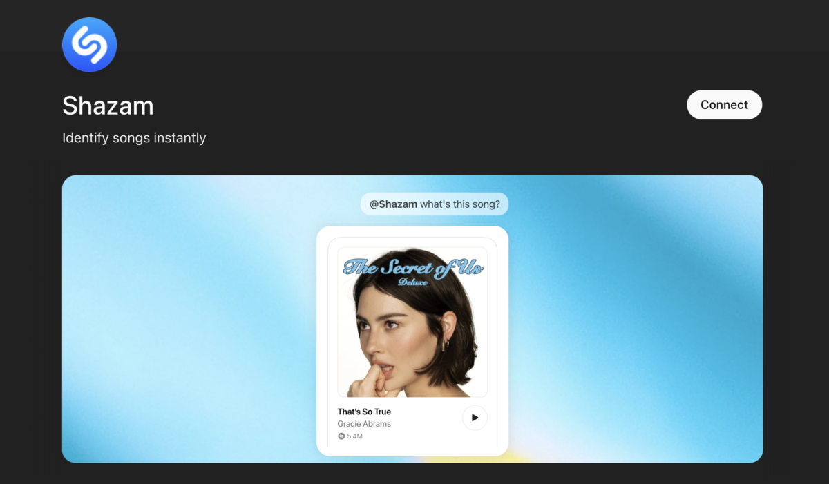ChatGPT, artık doğrudan Shazam entegrasyonu aracılığıyla şarkıları tanıyabiliyor, bu sayede kullanıcılar müziği Shazam uygulamasını açmadan tanıyabiliyor. Bu özellik, Shazam'ın manuel olarak bağlanması gereken ChatGPT'nin Uygulamalar bölümünden çalışıyor. Varsayılan olarak etkin değildir.