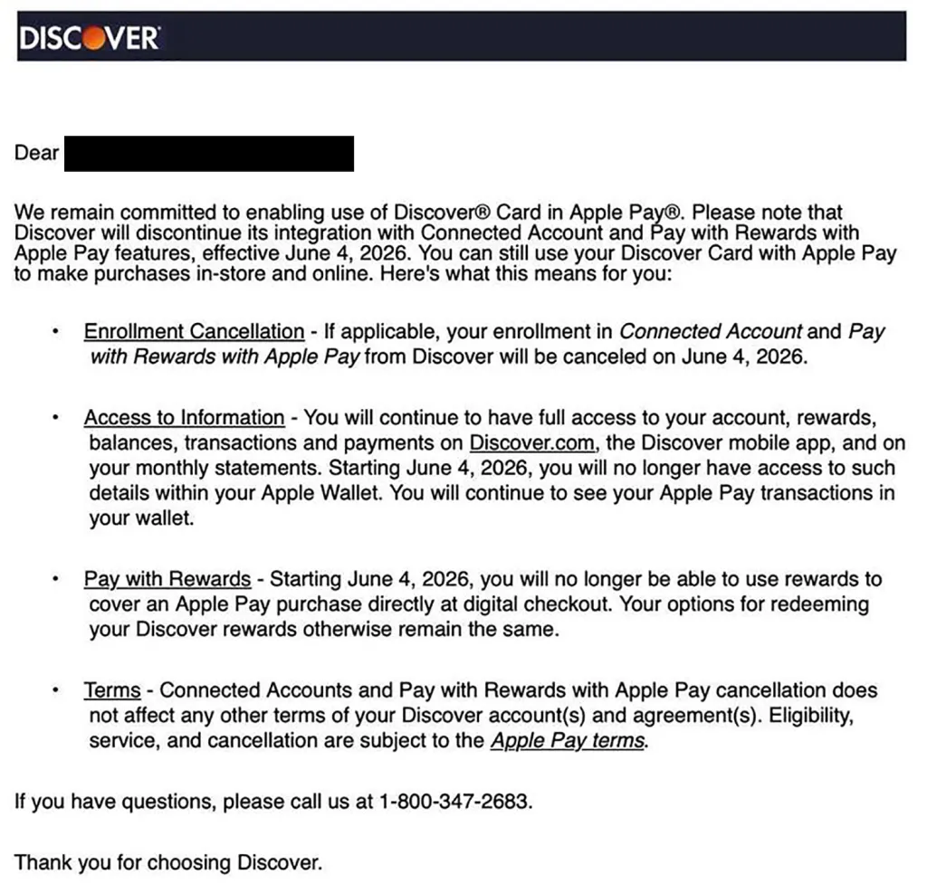 The email sent to cardholders states that the cancellation of the Linked Account and Rewards with Apple Pay will occur automatically and that this cancellation “will not affect the other terms of your Discover accounts and agreements.”