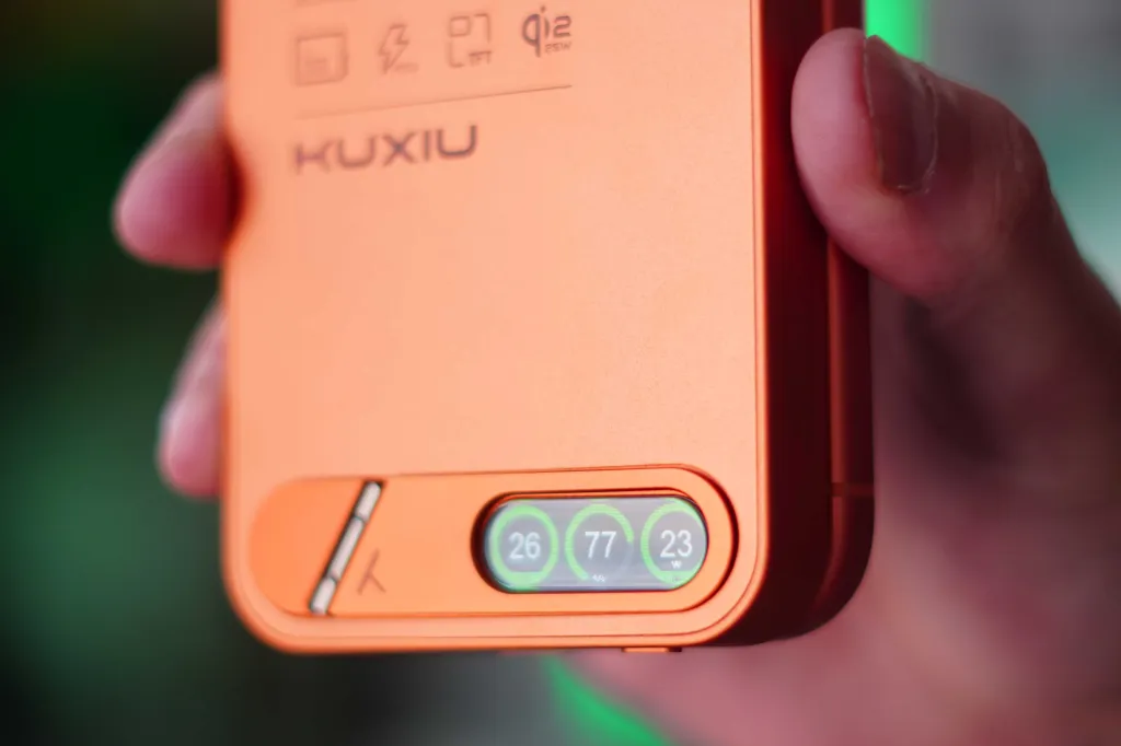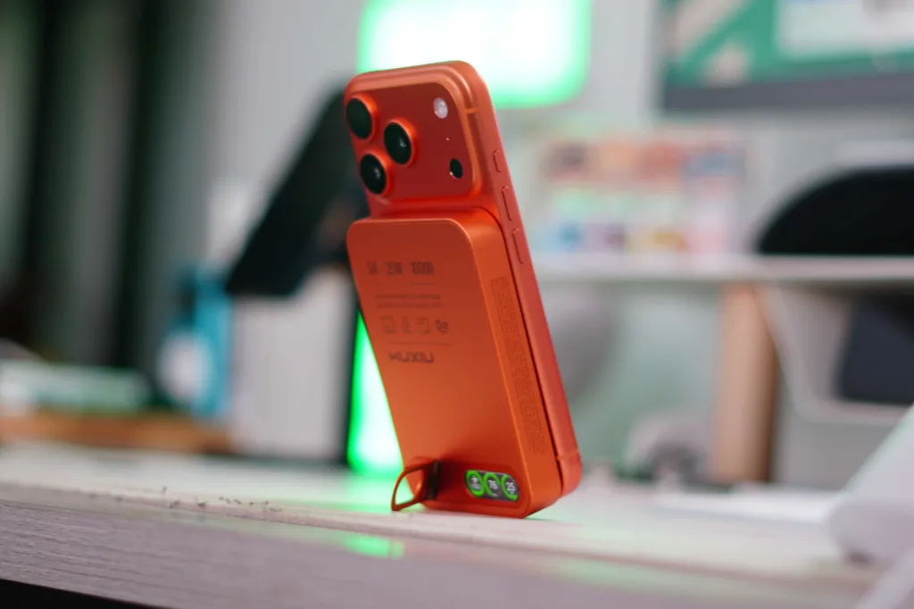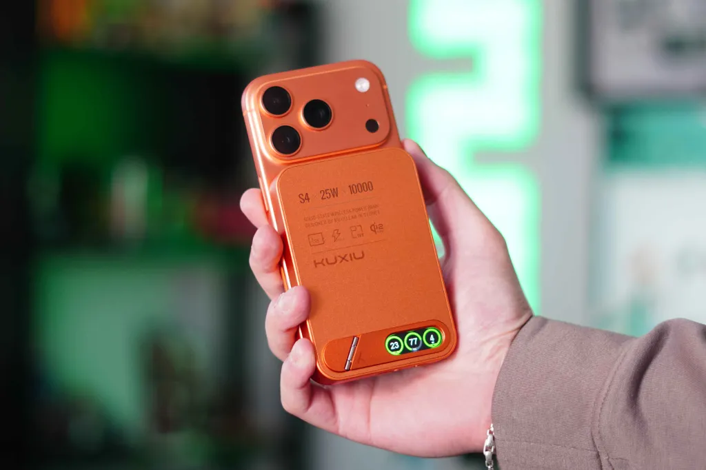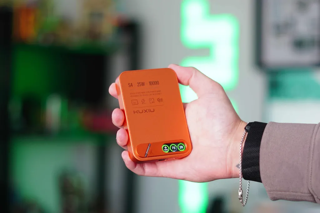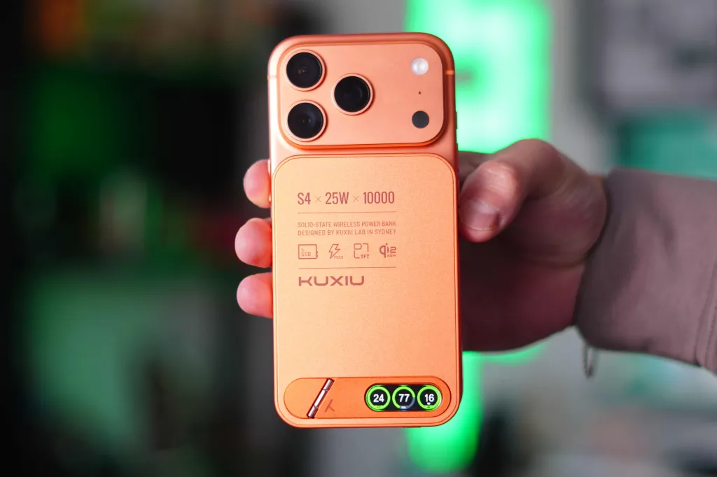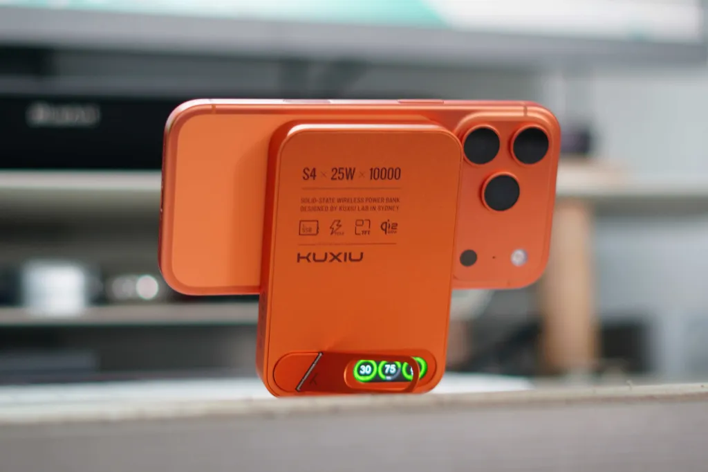 Kuxiu's new S4 is available today on Kuxiu's website for $84. Black and Cosmic Orange options are available, and the one I have is Orange. This has become my go-to charger that I use on days when I'm away from the office, and I also use it at home. As someone who has a 17 Pro (which has a smaller battery), I end my day with 5-15% battery life. So, when I'm done with work in the office around 6 PM, I love to plug in this battery and spend the rest of the day with it.
