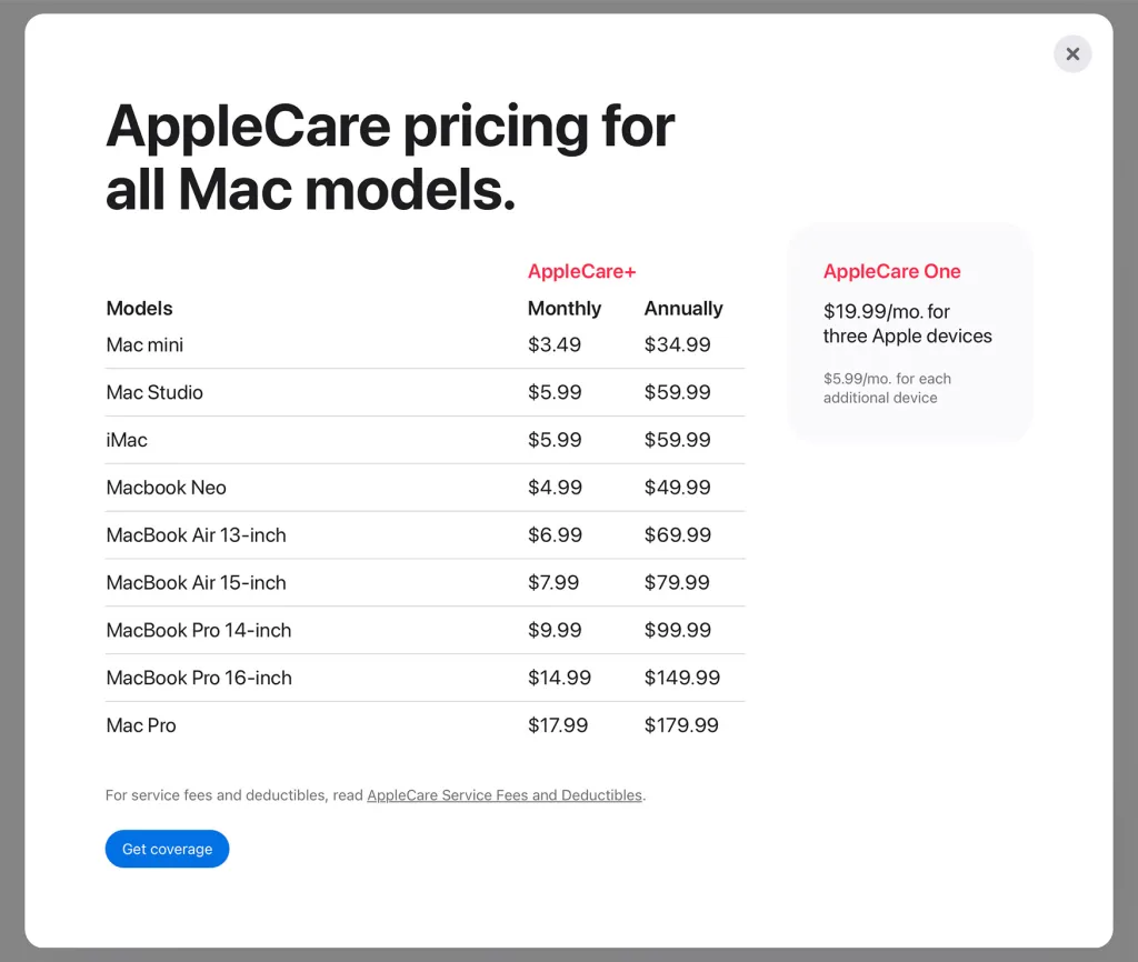 MacBook Neo'yu AppleCare+ ile korumayı seçen kullanıcılar için plan aylık $4.99 veya yıllık $49.99 maliyetle, bu da onu Mac mini'den sonra en ucuz AppleCare+ planı yapıyor.