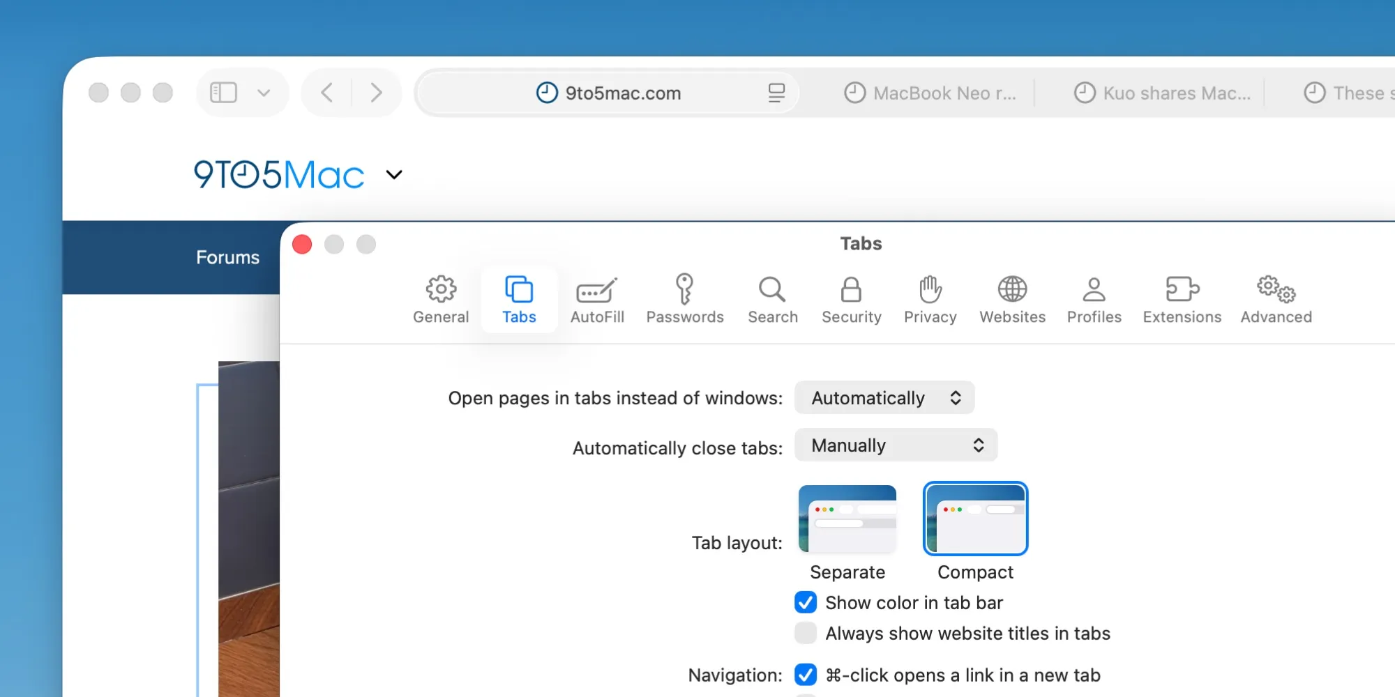 Ancak ister 13 inçlik bir MacBook Neo kullanıyor olun, ister 27 inçlik bir Studio Display XDR, macOS 26.4 ile tarayıcınızın üst kısmında temiz ve yoğun bir sekme çubuğu seçeneğine sahip olacaksınız.