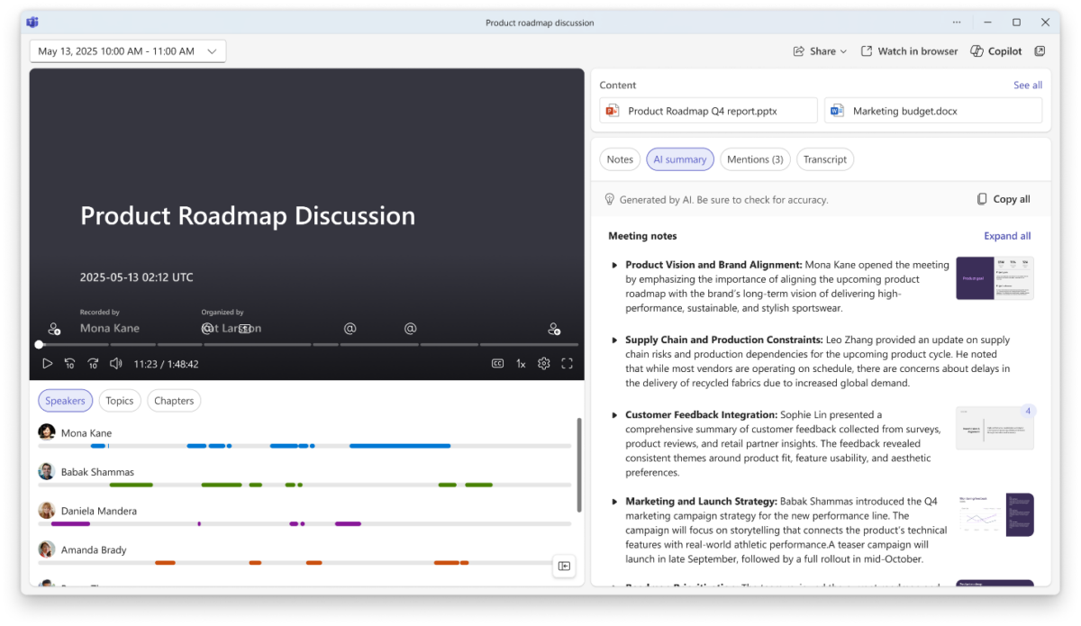 Bir ekran kaydedilen bir toplantı sırasında paylaşıldığında, Teams artık anahtar ekran görsellerini yakalayarak bunları toplantı özetinin ilgili bölümleriyle yan yana yerleştirebiliyor. Bu, yazılı özete görsel bağlam ekleyerek, kullanıcıların kararları sunulanlarla hızlıca ilişkilendirmelerine olanak tanıyor.