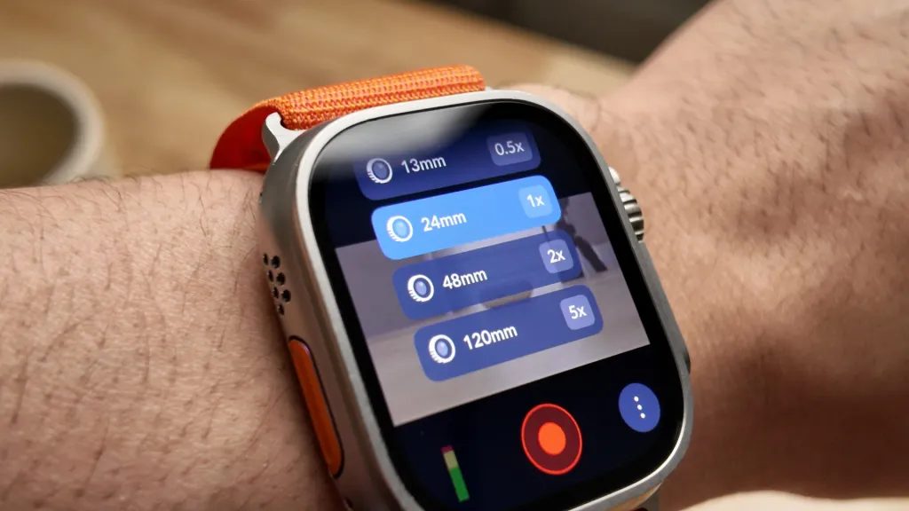 Dans l'application, en faisant défiler vers le haut ou vers le bas, les utilisateurs peuvent masquer ou afficher les informations autour du viseur, leur permettant ainsi de se concentrer entièrement sur le cadre de tournage. Et lorsque vous souhaitez passer d'un objectif à l'autre de l'iPhone ? Il suffit de tourner la couronne numérique de l'Apple Watch.