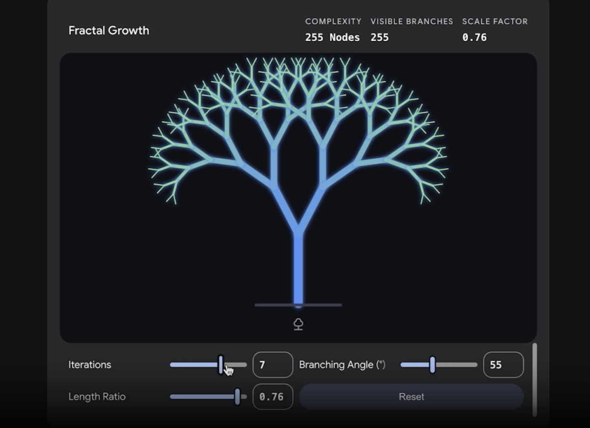 Cuando un usuario pregunta sobre un concepto que se beneficia de una representación visual, Gemini puede generar una simulación interactiva o modelo 3D personalizado. Entre los escenarios de uso mostrados se encuentran simulaciones de mecánica orbital con deslizadores ajustables para la fuerza de gravedad y la velocidad inicial, animaciones de péndulo doble y modelos moleculares 3D que se pueden hacer clic y arrastrar para ver desde cualquier ángulo.