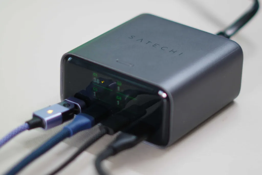 Satechi'nin yeni şarj cihazını ana masaüstü şarj cihazım olarak yaklaşık bir haftadır kullanıyorum ve bu, masa düzenimde kalıcı bir parça haline geldi. Başlangıçta söylediğim gibi, buradaki en büyük yükseltme ekran. Bu yeni trende büyük bir hayranım. Şarj cihazınızdan ne kadar çok görünürlük ve içgörü alırsanız, o kadar iyi. Sürekli olarak şarj cihazlarını, şarj hızlarını ve şarj protokollerini test eden biri olarak, gerçek zamanlı verileri okumak için bu ekranın olması çeşitli ürünleri test etmekte harika oldu. Port başına ve toplamda şarj hızlarını görebiliyorum. Ayrıca, gerçek zamanlı olarak görebileceğiniz sıcaklık güvenlik önlemleri de var. Eğer işler biraz sıcaklaşırsa, ekran soğutma moduna geçecektir. Toplam çıkışı maksimum seviyeye çıkardığınızda, yüksek güç seviyesinde çalıştığınızı gösteren bir ekran göreceksiniz. Ayrıca, şarj ettiğiniz belirli teknolojilerin AVS'den yararlandığını da görebilirsiniz, bu da oldukça hoş. Yani, bir şarj cihazı olarak, 16 inç MacBook Pro'yu tam 140W ile şarj etmek de dahil olmak üzere, karşılaştığınız her şeyi kaldırabiliyor.