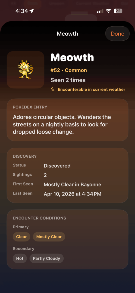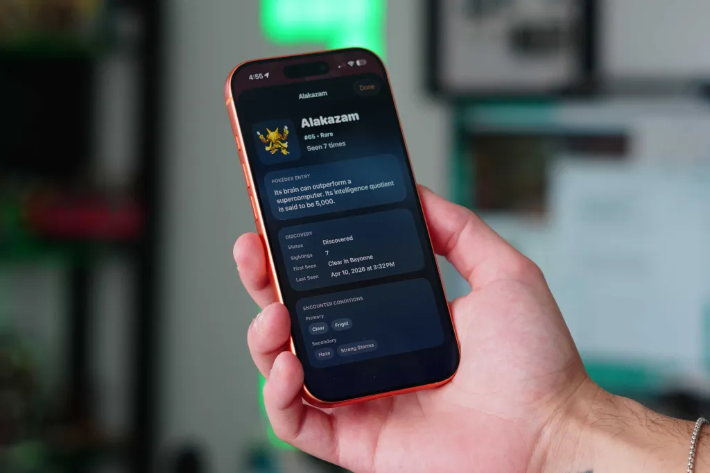 Üstelik, karşılaşmalarınızda bir nadirlik de var. Pokémonlar ya yaygın, ya nadir, ya da efsanevi. Yani, eğer bölgemde açık bir günse, bir Meowth bulma şansım yüksek, ama aynı zamanda nadir bir şey bulma şansım da var, örneğin bir Alakazam. Bu, biraz öngörülemezlik katıyor ve her kontrolü daha ödüllendirici hale getiriyor. Sonunda, bu Pokémonlarla karşılaşmaya başladığınızda, bunlar Dex'inize ekleniyor. Dex'inize eklendikten sonra, onların bilgilerini, ne zaman ve nerede keşfettiğinizi görebiliyor ve hatta Pokémon'un "çığlığını" (nasıl ses çıkardıklarını) dinleyebiliyorsunuz.