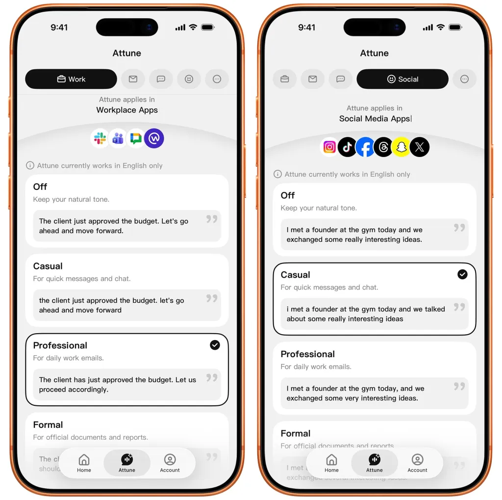 Benim deneyimime göre, SpeakON'un en büyük gücü, kullanıcıların kullandıkları uygulamaya bağlı olarak metni ayarlamak için Casual, Professional veya Formal ön ayarlarını seçmelerine olanak tanıyan Attune özelliğiydi.