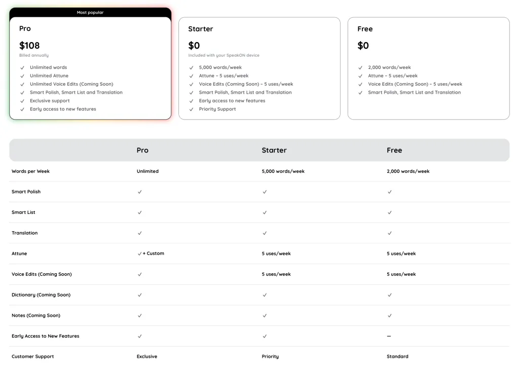 Cihazın kendisi 129 dolara mal olurken, daha yüksek kelime limitleri ve Attune gibi özelliklerin daha sık kullanımı Pro planına bağlıdır. Bu plan yıllık 108 dolar veya aylık 12 dolardır.