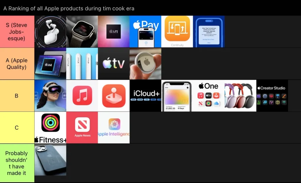 B katmanı ise arada kalan ürünler için. Harika olan ama belki de çok pahalı olan ürünler, örneğin Vision Pro, ya da ABD’de harika olan ama diğer ülkelerde mevcut olmayan ürünler, örneğin Apple Card. İşte benim B katmanım.
